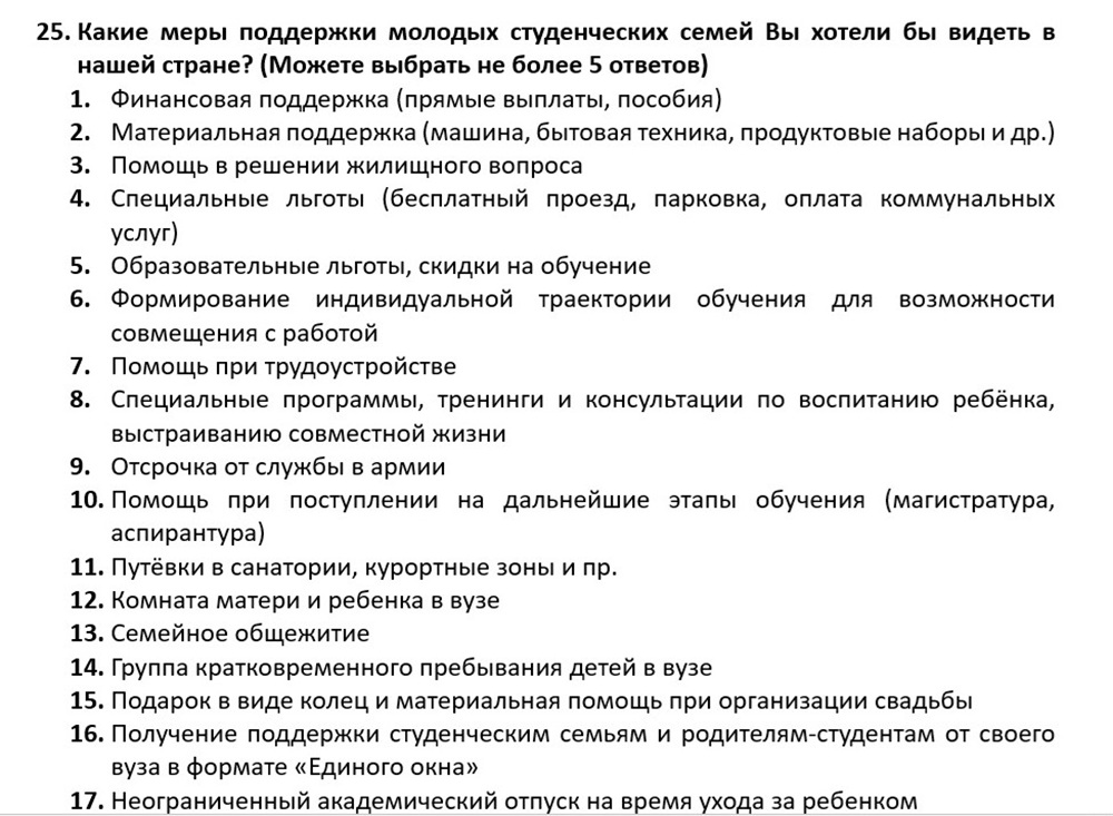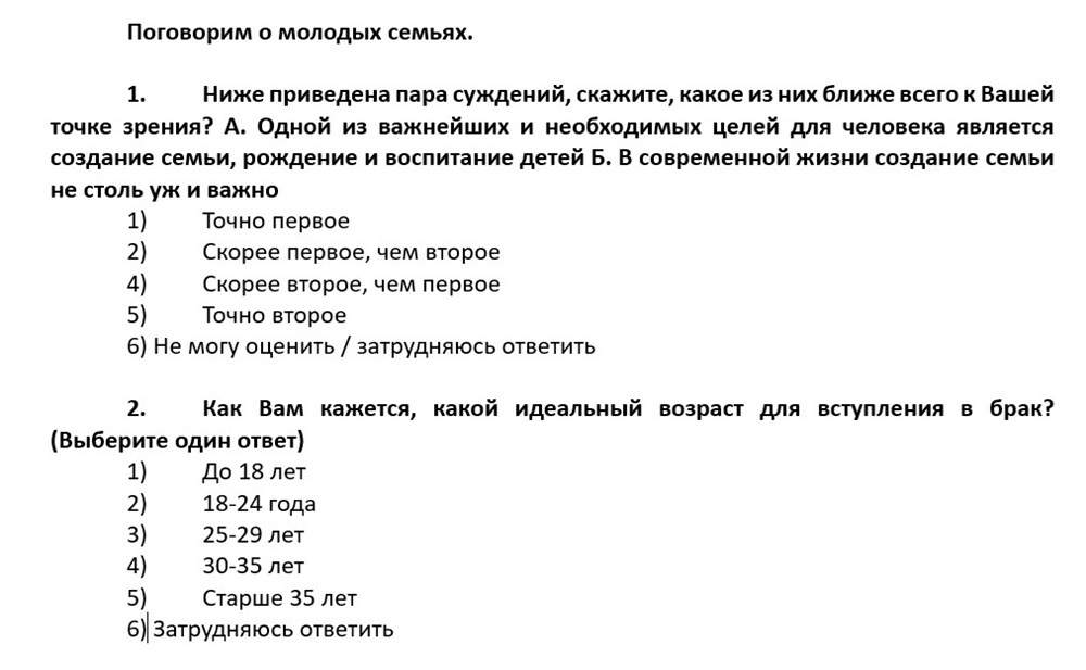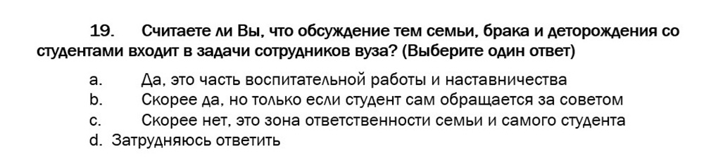Представителям более старшего поколения – преподавателям и сотрудникам филиала – предлагались вопросы о фактическом семейном положении, отношении к браку как к институту, планировании количества детей в семьях. Затрагивались моменты проведения мировоззренческих бесед со студентами о семейных ценностях, а также информирования их о существующих мерах поддержки молодых семей в нашем регионе.